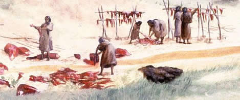 Famine descended, and the people were hungry. A man said, “Tomorrow I’ll go fishing.” The family went to bed without eating. The next day at dawn he left the house. The sun was rising. It was shining on the water. Suddenly the string attached to the fishnet quivered. A big salmon was in the net. He hauled it out and put it down in the back of the fishery.