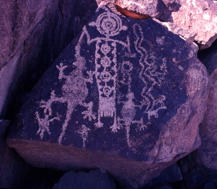 A key issue is whether such rock art images were produced exclusively by ritual specialists (shamans) or by community members in general. Ethnographic data for indigenous peoples of California and the Great Basin indicate that rock art creation was sometimes associated with activities other than shamanism, such as puberty ceremonies (Earle 2003; Hedges 2001; Kehoe 2002:74). In southern California, jimsonweed or toloache (Datura sp.) use was also correlated with dreaming as a personal means for ordinary people to acquire life-long spirit helpers. According to Ake Hultkrantz (1987a) a central element of traditional Numic ideology was the acquisition of supernatural power (puha) and guardian spirits; every young man was expected to seek visions and supernatural power. Furthermore, in traditional Numic society, the boundary line between common visionaries, medicine men, and shamanic specialists was often slight (Hultkrantz 1987a:32). One could only differentiate a commoner from a ritual specialist by the number of his spiritual assistants. This situation reflected the great emphasis in accounts of Chemehuevi, Southern Paiute, and other southern Numic religion on the shaman as a specialized curer as opposed to a generalized ritual leader. Of possible further note is that the terms for a person with supernatural powers in Numic languages – huviya-ga-dї / poha-ga-dї / ’uu-poha-ga-dї – have as their root the word ‘aga, which means to paint or to rub (Zigmond et al. 1990). This provides a strong suggestion that authors of paintings and petroglyphs were individuals who had acquired or were actively acquiring supernatural power. The abundance of Coso petroglyphs and the great amount of labor they represent also argue against their exclusive production by an elite class of ritual specialists commonly identified as shamans (Bard and Busby 1974; Garfinkel 2006:230).