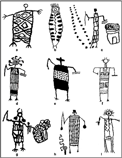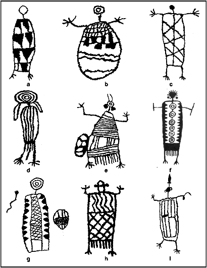 PBAs are elaborate renderings – mixing human and animal characteristics (Figures 6, 7, and 8). They are always decorated, never plain, and never solid-bodied. PBAs are diverse, no two images being identical, although designs found in one PBA often occur in another. They usually have elongated rectangular or (infrequently) ovoid torsos embellished with stripes, checks, circles, chevrons, dots, meandering lines, triangles, bars, or cross-hatching. In many instances, at the base of the torso, is a series of short vertical lines, sometimes likened to a fringe on a garment or what is commonly identified as a “rake” design. Many figures have two thin, straight, perpendicular legs that end in claw-like, taloned “bird” feet (Figures 6a, 6c, 6d, 6e, 6f, 6g, 7c, 7e, 7f, 7h, 7i, 8c, and 9).