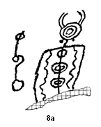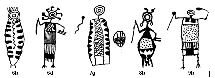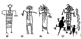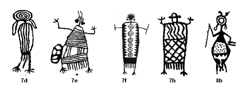 Some Kawaiisu accounts portray the Animal Master as an androgynous being, recognized in human dreams in either male or female form. Six PBA images of the Coso Range exhibit human phalli (Figure 6g and 7d). Some Coso PBA figures exhibit characteristic feminine elements (Figures 7b and 8b). Elements of both sexes are found on certain figures. However, in most instances PBAs do not allow us to confidently distinguish gender.